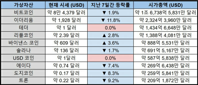 이더리움은 11.8% 하락하며 1천928달러에 머물렀고시가총액은 약 2천324억 3천960만 달러로 감소했다.