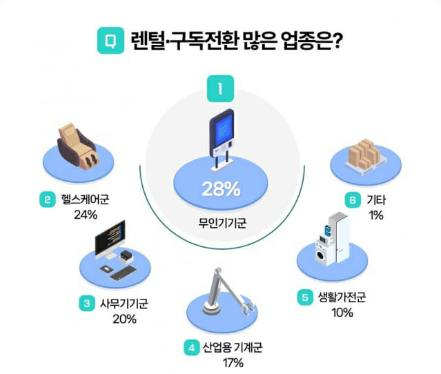 렌털·구독 서비스 도입 상담이 가장 많았던 제조·판매사 업종은 키오스크·스마트자판기·테이블오더·서빙로봇 등 무인기기군(28%)이었다.