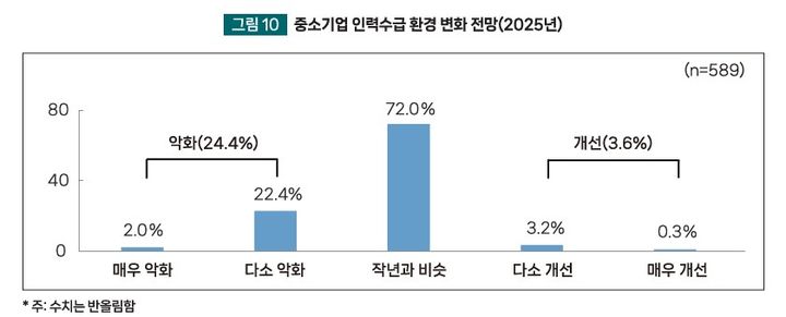 중소기업들은 내년 역시 상황은 나아지지 않을 것이라 점쳤다. 내년 인력수급 환경이 악화될 것이라는 응답은 23.8%로 개선될 것이라는 대답(12.4%) 대비 높게 나타났다.