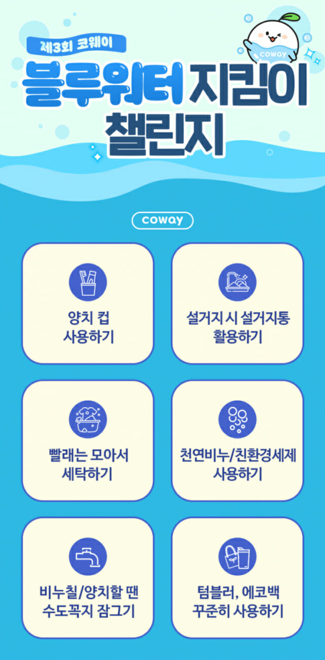 블루워터 지킴이 챌린지는 코웨이 ESG 환경 경영 활동의 일환이며 일상생활 속 가벼운 실천을 통해 깨끗한 물을 지켜 나가자는 취지로 기획된 캠페인이다. 지난 2023년 시작해 올해 3회째다.