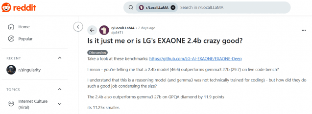 LG AI연구원의 소형 인공지능(AI) 모델이 해외 AI 커뮤니티에서 대형 모델과 견줄 만한 성능을 갖췄다며 호평을 받고 있다. (사진=레딧 캡처)