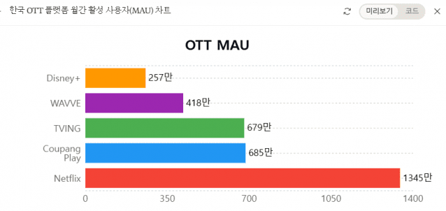 현재 디즈니플러스는 국내 주요 OTT 플랫폼 중 최하위를 기록하고 있다. 모바일인덱스에 따르면, 지난달 디즈니플러스의 월간 활성 사용자 수(MAU)는 257만 명으로 넷플릭스(1천345만 명), 쿠팡플레이(685만 명), 티빙(679만 명), 웨이브(418만 명)와 큰 격차를 보였다.