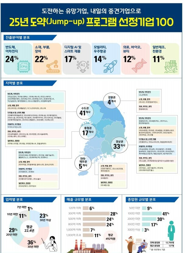 23일 중기부는 올해부터 본격 시행하는 ‘도약(Jump-Up) 프로그램’의 지원기업 100개사를 최종 선발했다고 밝혔다. 렉스젠, 인젠트 등 수도권 기업 41곳과 경상권 기업 33곳, 충청권 17곳, 전라 및 제주권 5곳, 강원권 4곳 등이 뽑혔다.