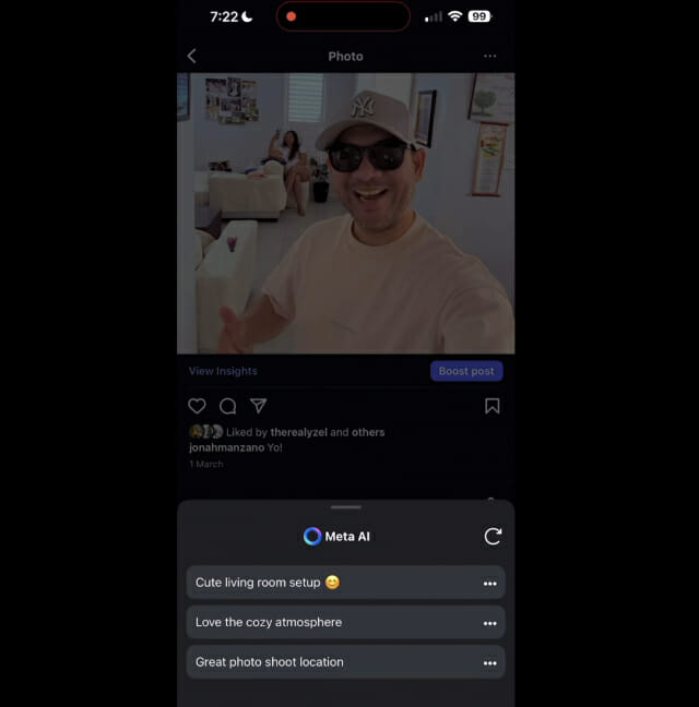 새로운 소셜 미디어(SNS) 기능을 테스트하는 전문가인 요나 만자노(Jonah Manzano)는 자신의 X(옛 트위터)를 통해 이 같은 사실과 함께 관련 영상을 공개했다. 이 비디오에서 선보여진 ‘메타 AI’ 기능은 게시물 아래의 텍스트 막대 옆에 연필 아이콘 모양으로 표시돼 있으며 이를 클릭하면 접속할 수 있었다. 메타 AI는 사진을 분석한 후 댓글에 대한 세 가지 제안을 했고, 마음에 들지 않 새로 고침하면 다른 댓글을 제안했다.