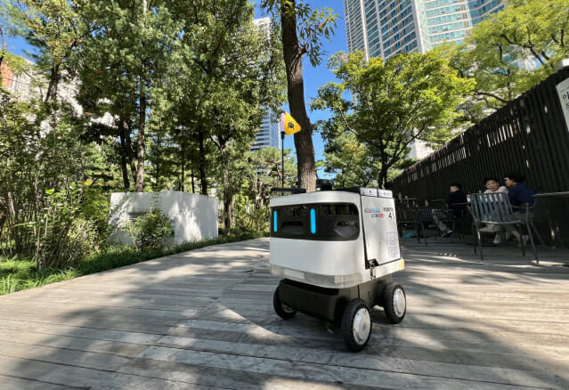로보티즈 실외 자율주행로봇 '개미'가 양천구 오목공원에서 재활용품 수거와 순찰 업무를 시작했다. (사진=지디넷코리아 신영빈 기자)