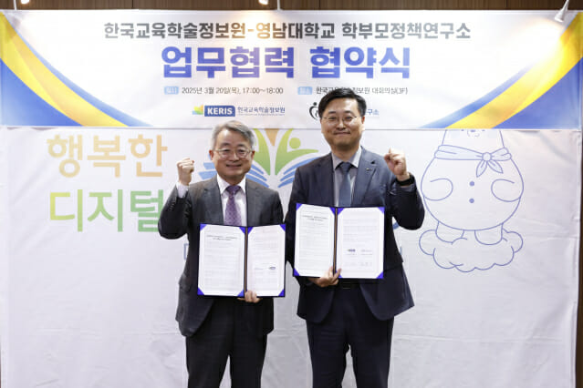 한국교육학술정보원(KERIS)과 영남대 학부모정책연구소가 지난 20일 학부모의 디지털 교육 정책 공감대 확산과 인식 제고를 위한 업무협약(MOU)을 체결했다. 이번 협약을 통해 학부모 역량 강화를 위한 협력 체제를 구축하고 학부모 정책 발전과 인식 확산을 위한 협력 사업 등을 추진한다.