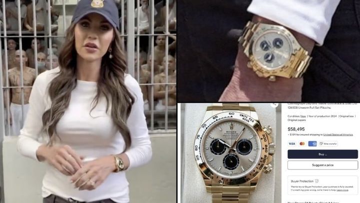 [서울=뉴시스]허나우 인턴 기자 = 엘살바도르에 있는 중남미 최대 테러범 수용소를 방문한 크리아티 놈 미국 국토안보부 장관이 반쯤 벌거벗은 수감자들을 배경으로 촬영한 영상을 소셜미디어(SNS)에 올리자, 그가 착용한 6만 달러(약 8800만 원)짜리 시계가 포착되며 논란이 일고 있다.