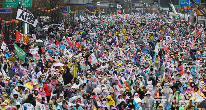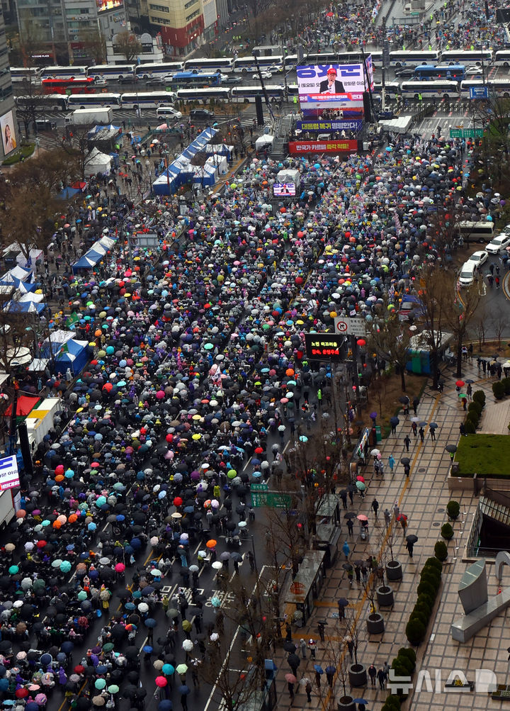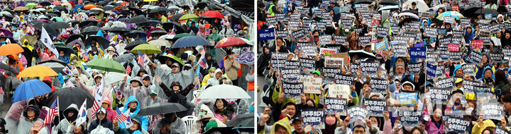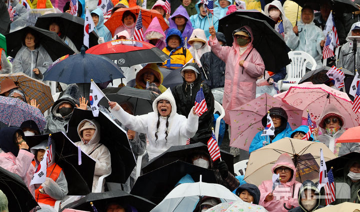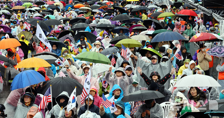 이날 오후 1시30분께 경찰 비공식 추산 약 1만5000명의 참가자들은 비가 오는 궂은 날씨 속 한 손에는 우산을, 다른 손에는 태극기와 성조기를 들고 흔들었다. 일부 지지자들은 우비를 입고 ‘반국가세력 척결한다’ ‘국민저항권 발동’ 손팻말을 들고 “사기 탄핵” “조기 대선 무효”를 외치기도 했다.