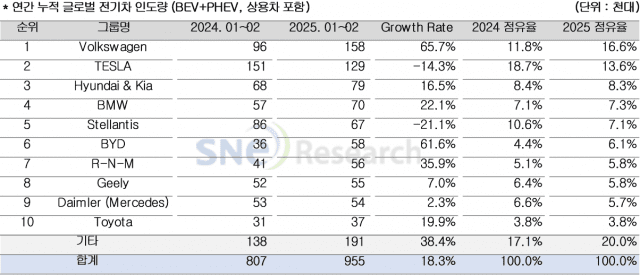 SNE리서치에 따르면 이 기간 폭스바겐 그룹은 전년 대비 65.7% 증가한 15만8천대 판매량을 기록해 테슬라를 제치고 1위에 올랐다. 특히 유럽과 북미에서 각각 65%, 72% 성장하며 높은 성장률을 기록했다.