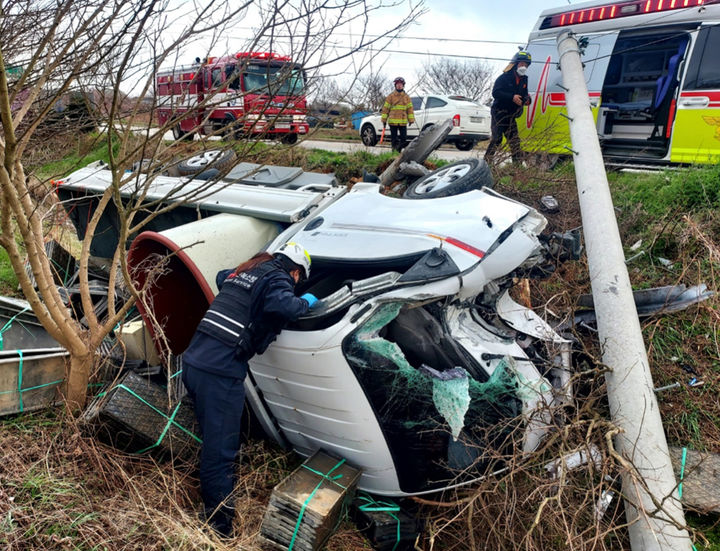[익산=뉴시스]강경호 기자 = 13일 오후 3시3분께 전북 익산시의 한 골프연습장 인근 도로에서 1t 트럭이 전봇대를 들이받았다.