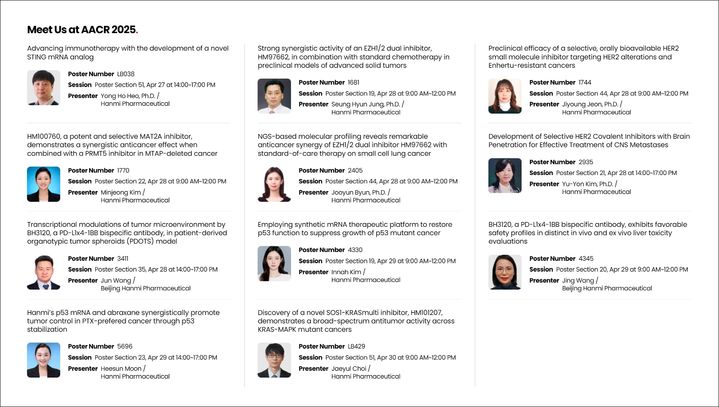 이번 AACR에서 ▲EZH1·2 이중저해제(HM97662) 2건 ▲선택적 HER2 저해제(HM100714) 2건 ▲MAT2A 저해제(HM100760) ▲SOS1 저해제(HM101207) ▲STING mRNA 항암 신약 ▲p53-mRNA 항암 신약 2건과, 북경한미약품이 주도적으로 개발하고 있는 이중항체 플랫폼(펜탐바디) 기반의 ▲BH3120 2건 등 총 7개 신약 후보물질에 관한 연구 결과를 포스터로 발표한다.