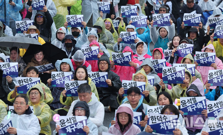 내란 종식·사회 대개혁 비상행동 주최로 열린 이번 집회에서 참가자들은 윤석열 전 대통령 구속과 한덕수 대통령 권한대행 처벌을 촉구하는 손피켓을 들고 구호를 외쳤다.