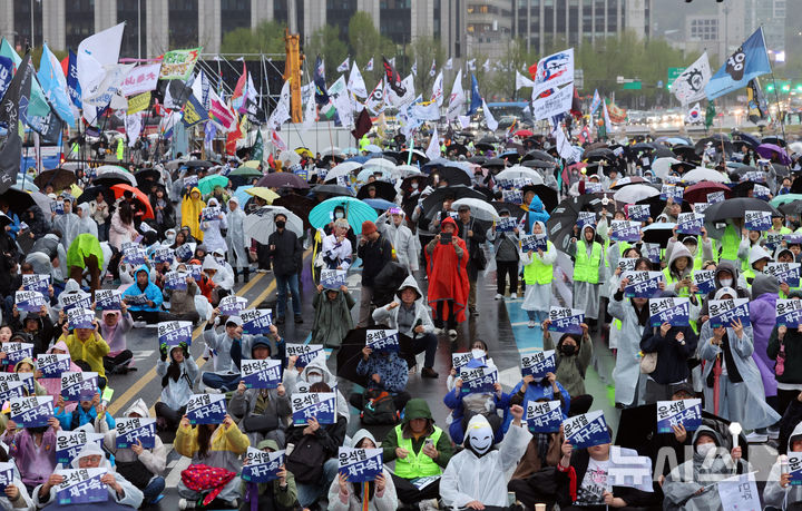 [서울=뉴시스] 김금보 기자 = 19일 서울 종로구 광화문 동십자각 앞에서 ‘내란 종식, 사회 대개혁을 위한 시민행진’ 집회가 열렸다.