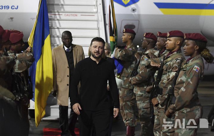 [서울=뉴시스] 차미례 기자 = 볼로디미르 젤렌스키 우크라이나 대통령이 24일(현지시간) 남아프리카 공화국의 행정수도 프리토리아를 방문, 시릴 라마포사 대통령의 환영을 받았다고 AFP, 신화통신 등이 보도했다.