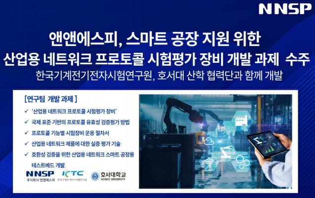 앤앤에스피는 한국기계전기전자시험연구원, 호서대학교 산학협력단과 함께 3년 9개월 간 국제 표준에 정의된 산업용 네트워크 프로토콜인 ‘라피넷(RAPIEnet+)’ 시험 평가 장비를 개발한다. 이번 과제를 완료하면 미국과 유럽 등 글로벌 기업이 주도하고 있는 산업용 네트워크 시장에 국내 장비 업체의 국제 경쟁력 향상이 기대 된다.