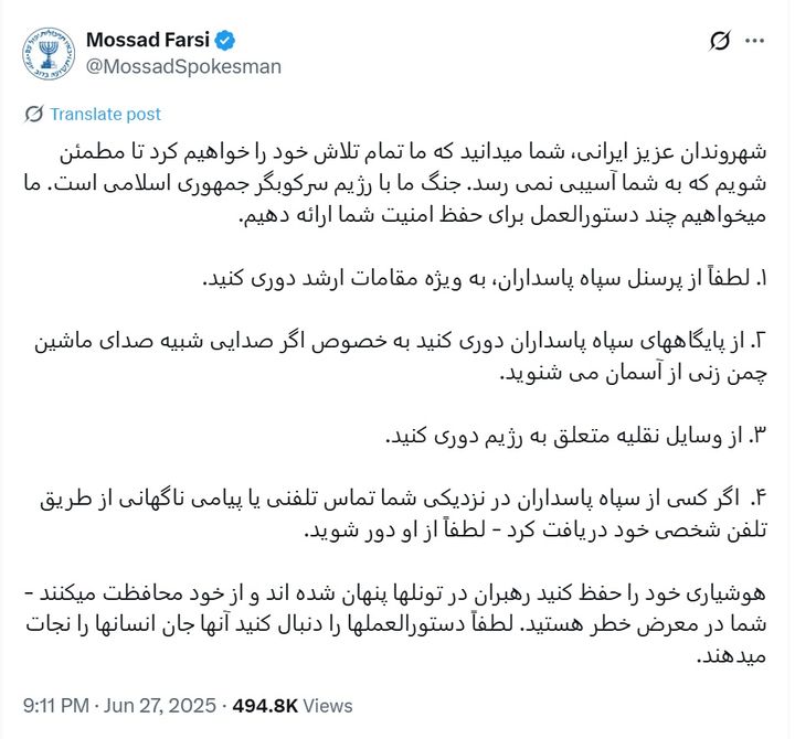 모사드는 27일(현지 시간) 페르시아어 X(구 트위터) 계정으로 이란 주민을 향해 “IRGC 요원들, 특히 고위 당국자들과 거리를 두라”라고 권고했다.