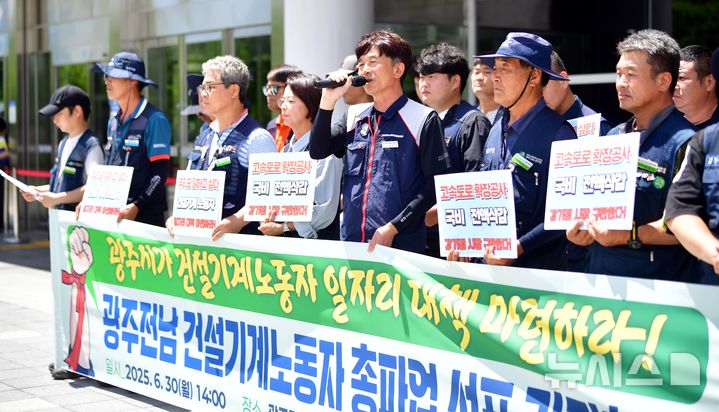 민주노총 전국건설노동조합 광주전남건설기계지부는 30일 광주 서구 광주시청 앞에서 기자회견을 열어 “강기정 시장의 무책임한 행정 처리로 건설기계 노동자들은 더 이상 물러설 곳이 없다”며 이같이 밝혔다.