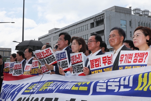 국민의힘이 서울 용산 대통령실 앞에서 현장 의원총회를 열고 김민석 국무총리 후보자의 지명 철회를 촉구했습니다.