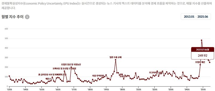 EPU는 언론 보도를 기반으로 경제정책의 불확실성을 계량화한 지표다. 정치적 불안이나 정책 혼선, 대외 리스크가 고조되면 수치가 상승한다.