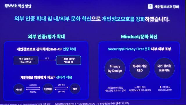 정보보호 체계뿐만 아니라 내·외부 검증 체계도 강화할 예정이다. 개인정보보호위원회가 주관하는 개인정보보호 관리체계(ISMS-P) 인증 대상을 이동통신 인프라 및 시스템으로 확대하고, 공공기관만 의무 시행 중인 개인정보 영향 평가도 적용할 예정이다.
