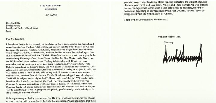 트럼프 대통령은 이날 소셜미디어(SNS) 트루스소셜을 통해 8월1일부터 한국에 25% 상호관세를 부과하겠다는 서한을 공개했다.