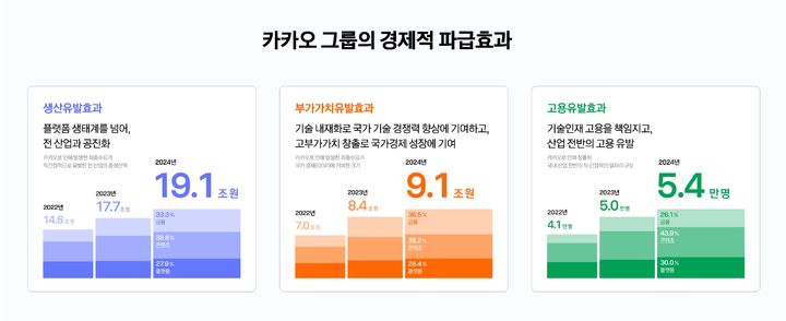 카카오는 최근 3년간 누적 경제적 파급효과로 생산유발효과 51조4000억원, 부가가치유발효과 24조5000억원, 고용유발효과 약 14만5000명에 달했다고 밝혔다. 카카오는 모바일 메신저를 시작으로 문화 콘텐츠, 금융, 모빌리티 등 다양한 분야에서 디지털 생태계를 구축해 온 결과라고 설명했다.