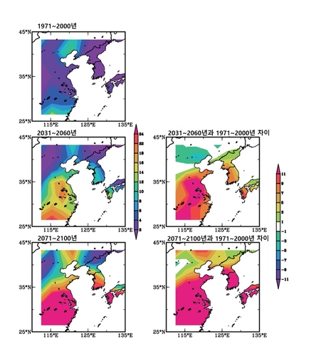 기후변화 시나리오에 따른 산불기상지수(위험도) 변화 예측[산림청 제공. 연합뉴스][산림청 제공. 연합뉴스]산림청은 오늘(10일) 상대적으로 화재 발생 위험이 적었던 여름에도 유례없는 폭염과 건조 현상 탓에 산불이 지속되고 있다고 주의를 당부했습니다.