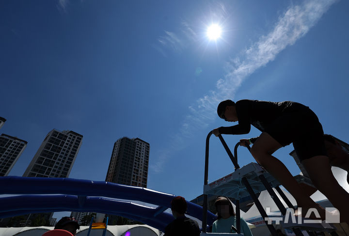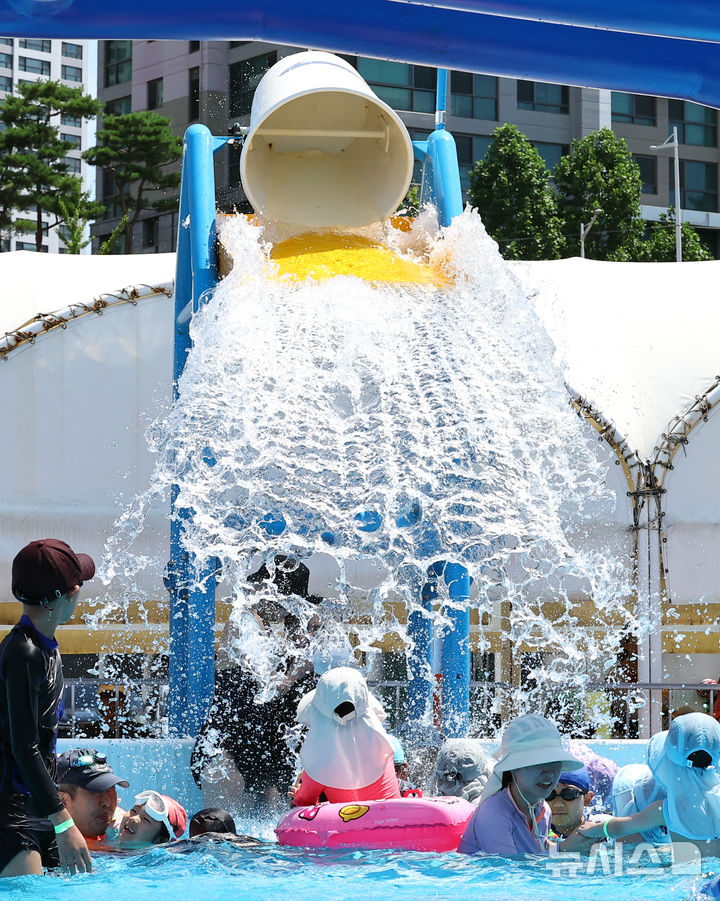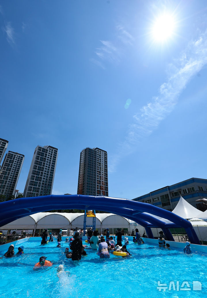 전국 대부분 지역에 폭염특보가 발효된 26일 서울 서초구 반포종합운동장에 마련된 서리풀 물놀이장에서 주민들이 더위를 식히고 있다.