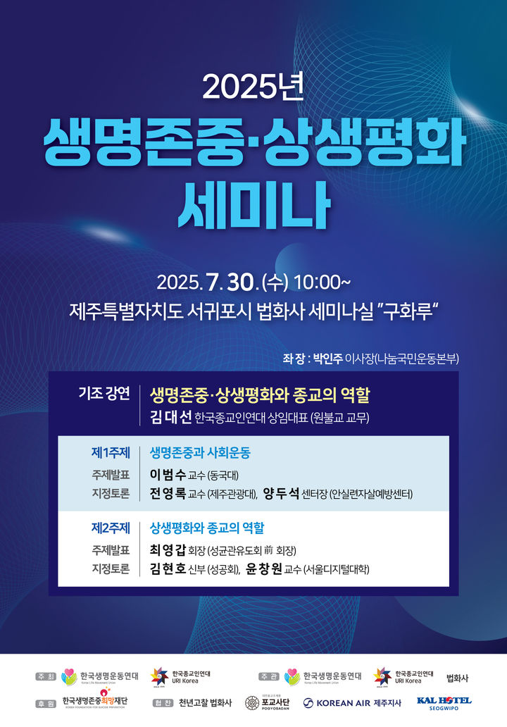 [서울=뉴시스]이다솜 기자 = 30일 33개 시민단체로 구성된 생명운동연대와 기독교 등 7대 종단의 협력네트워크인 한국종교인연대는 공동으로 제주도에 있는 법화사 세미나실에서 종교지도자와 생명운동 전문가 등 100여명이 참석한 가운데 ‘생명존중·상생평화세미나’를 개최하고 종교인 1000명 선언문을 채택했다고 밝혔다.