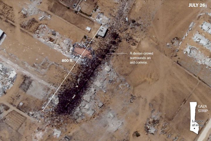 지난달 31일(현지시각) 뉴욕타임스에 따르면 28일 위성사진 업체 플래닛랩스는 가자지구로부터 320km 떨어진 위성이 이틀 전 포착한 수백 명의 팔레스타인인들이 구호품 차량을 향해 몰려드는 장면을 공개했다.