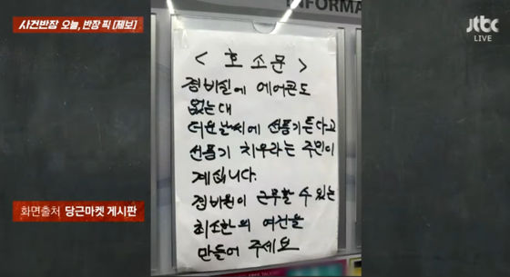 지난 1일 방송된 JTBC ‘사건반장’에 따르면 경기 부천시의 한 아파트 승강기에는 경비원의 호소문이 붙었다.