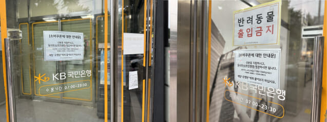 4일 K은행 홍제동 지점의 모든 출입구에는 ‘소비쿠폰에 대한 안내문’이 부착됐다. 안내문에는 ‘신분증 지참하시고, 동사무소(주민센터) 방문하시면 됩니다. 국민카드 소지 고객님은 아래로 전화하십시요. 제발 “은행원”에게 물어보지 마십시오’ 라는 내용이 적혀있다.