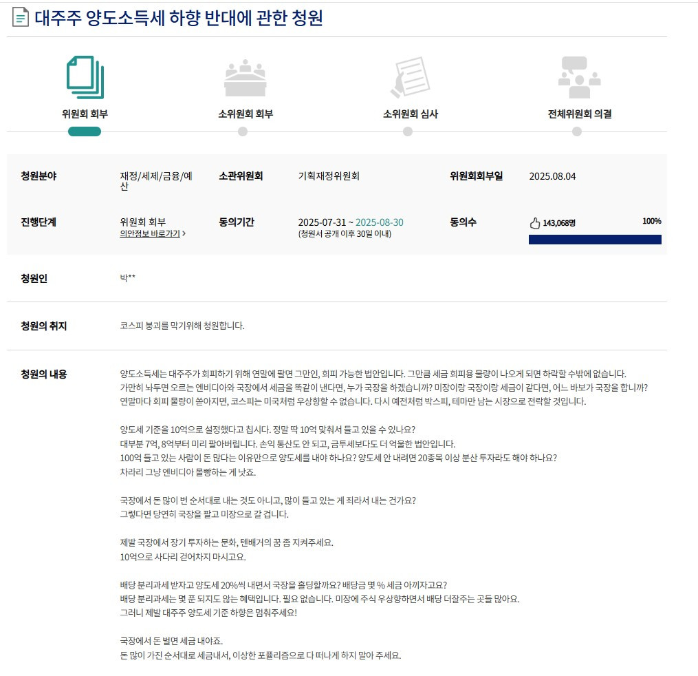 그런데 대주주 기준 강화하는 것에 대해 국내 투자자들의 불만이 쇄도하는 분위기입니다.