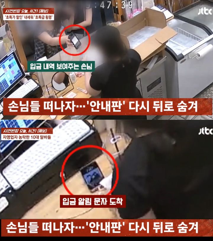 알고 보니 아르바이트생 2명이 근무할 때마다 ‘계좌이체 시 2000원 할인’ 안내판을 내걸고 손님이 보낸 돈을 개인 계좌로 받았던 것이다. 범행 장면은 매장 폐쇄회로(CC)TV에 고스란히 찍혔다. 계산대 위 휴대전화에는 ‘입금 알림’ 메시지가 떴고, A씨는 지인을 손님으로 위장시켜 추가 증거까지 확보했다.