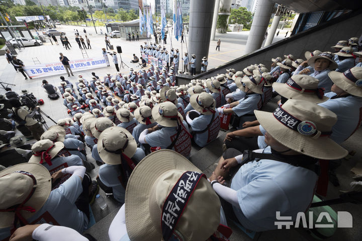 [서울=뉴시스] 조성봉 김근수 한이재 기자 = 80주년 광복절인 15일 양대노총이 자주평화 실현을 외쳤다.