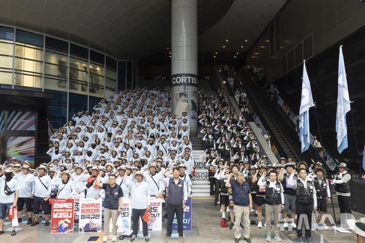김광창 민주노총 서비스연맹 위원장은 “지난 7월 31일 한미통상협상을 정부와 언론은 선방했다고 했다”며 “미 제국주의자에게 이 땅 노동자가 피땀으로 만든 국부가 유출되고 우리 일자리와 물량이 빼앗기는데 어떻게 잘한 협상이냐”며 비판했다.