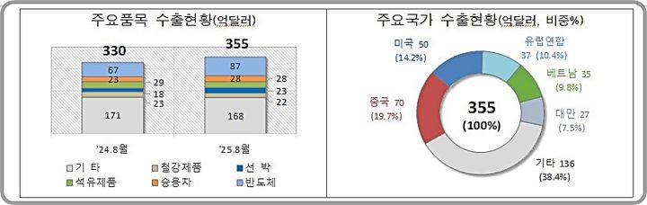 [대전=뉴시스] 김양수 기자 = 8월 들어 미국과의 무역은 주춤했지만 중국, 유럽연합, 대만 등과의 교역이 늘면서 수출·입이 모두 증가했다.