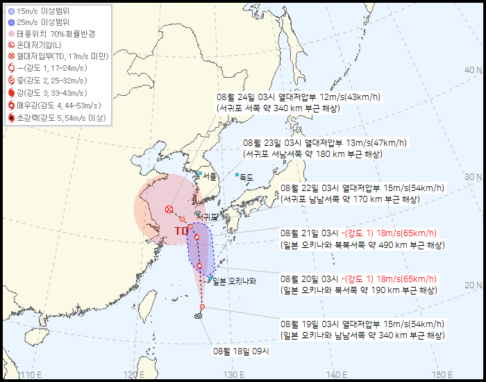 28호 열대저압부는 동북동쪽으로 이동하며 22일(금) ‘강도1’의 태풍으로 발달하겠고 일본 규슈에 상륙한 뒤 23일(토)에 다시 한번 위력이 약해질 전망입니다.