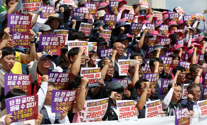 24일 국회와 고용노동부에 따르면 이날 국회는 본회의에서 재적 186명, 찬성 183명, 반대 3명으로 노조법 개정안을 의결했다. 국민의힘은 투표에 불참했다.