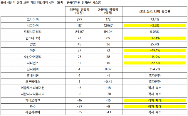 이 외에도 이글루코퍼레이션과 지란지교시큐리티, 라온시큐어는 영업적자 규모를 전년 대비 축소했고, 휴네시온과 오픈베이스는 지난해 상반기 적자에서 올해 상반기에는 흑자로 돌아섰다.