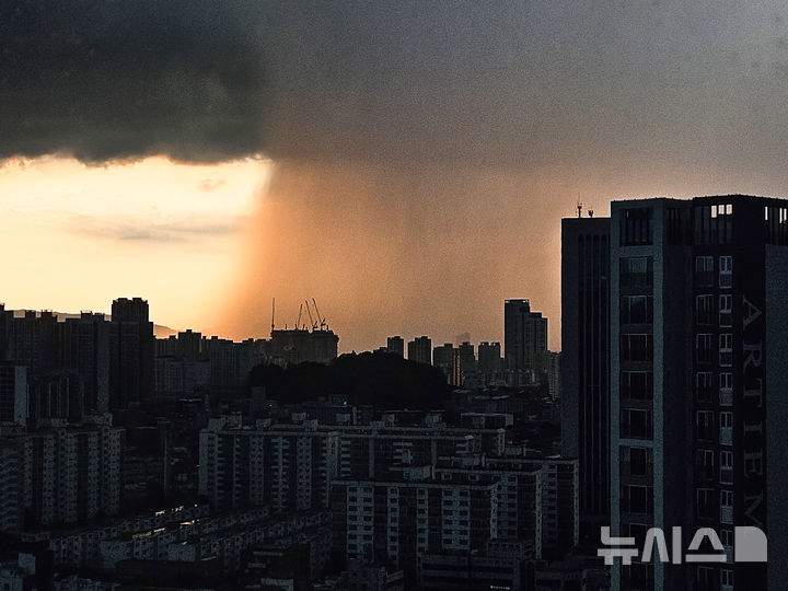 [광주=뉴시스]이영주 기자 = 30일 오후 광주 도심 상공에 비구름이 발달, 소나기가 내리고 있다.