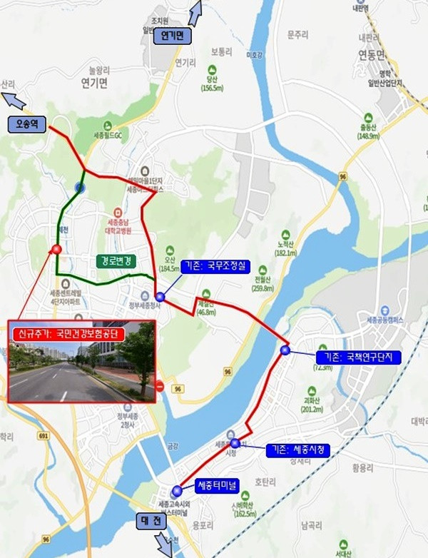 시외버스 노선은 세종터미널, 세종시청, 국책연구단지, 국무조정실, 죽전정류장(경부고속도로)을 거쳐 서울경부터미널로 향하는 기존 노선에 국민건강보험공단 정류소가 추가됐습니다.