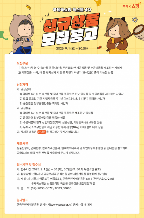 신청은 우체국쇼핑몰과 한국우편사업진흥원 홈페이지에 게재된 모집 공고를 확인한 뒤, 신청서와 관련 서류를 동봉해 30일까지 우편으로 제출하면 된다.