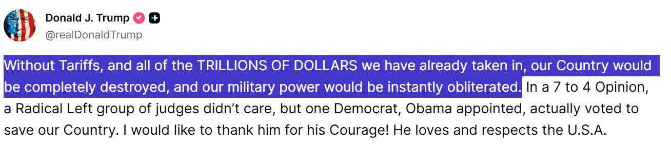 트럼프 대통령은 SNS를 통해 “관세, 그리고 우리가 이미 거둬들인 수조 달러가 없었다면, 미국은 완전히 파괴되고 군사력은 즉시 소멸됐을 것”이라고 게시했습니다.