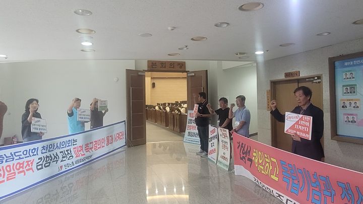 본회의 의결을 촉구하기 위해 이날 본회의장을 찾은 천안역사문화연구회 등 시민단체 관계자들도 안건 미상정 소식에 적잖이 당황하는 모습이었다.