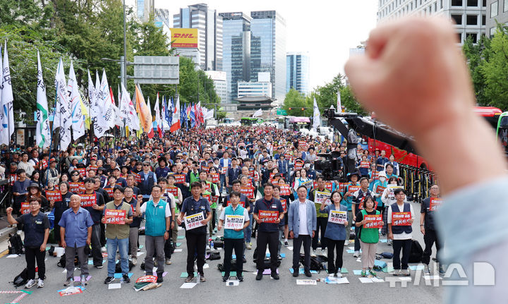 [서울=뉴시스]조성우 이다솜 기자 = 전국민주노동조합총연맹(민주노총)은 이날 오후 3시 서울 지하철 1·2호선 시청역 일대에서 ‘9.13 결의대회’를 개최했다.