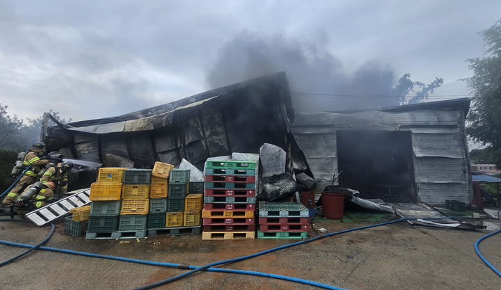 [익산=뉴시스] 김종효 기자 = 13일 오전 6시께 전북 익산 금마면의 한 조립식 창고건물에서 화재가 발생해 불이 났다.