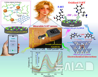 [김해=뉴시스] 김상우 기자 = 인제대학교 홍용근 교수 연구팀이 사람의 땀에서 세로토닌(5-HT)을 비침습적으로 실시간 감지하는 웨어러블 전기화학 센서를 개발했다고 18일 밝혔다.