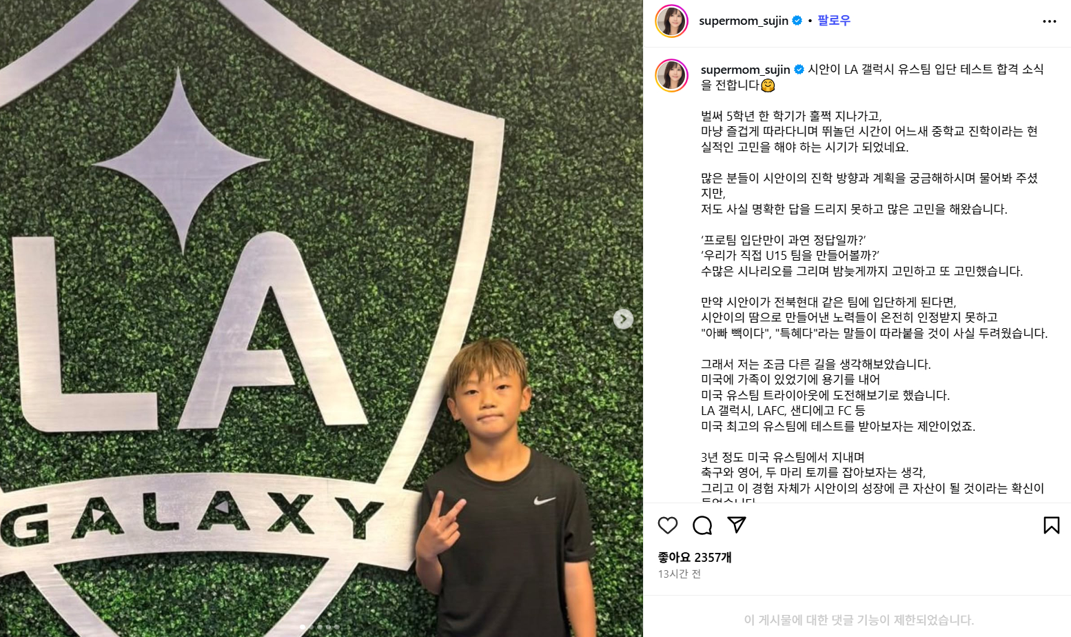 이동국 아내 이수진씨 SNS 캡처이동국 아내 이수진씨 SNS 캡처전북 현대 간판 공격수로 활약했던 이동국의 장남 이시안 군이 미국 메이저리그사커, MLS 명문 LA 갤럭시의 U15(15세 이하) 유스팀의 테스트를 통과한 사실이 알려져 화제입니다.
