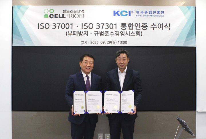 [서울=뉴시스]송연주 기자 = 제약바이오 기업 셀트리온제약은 한국준법진흥원(KCI)으로부터 ISO 37001(부패방지 경영시스템)과 ISO 37301(규범준수 경영시스템) 통합인증을 획득했다고 30일 밝혔다.